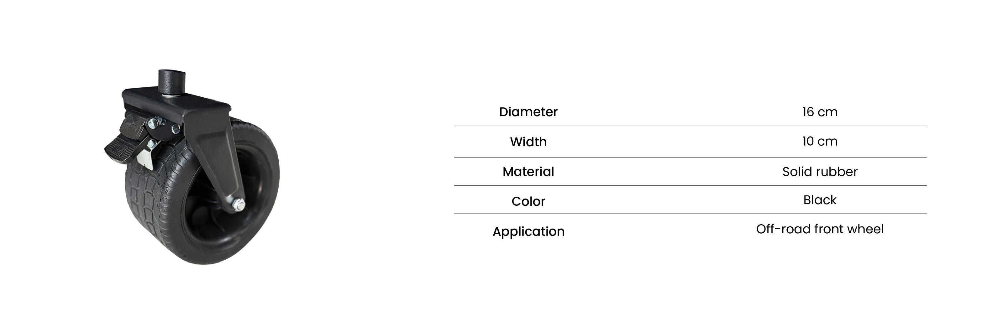 Durable solid rubber wheels with a wide 10cm tread and 16cm diameter deliver stable, puncture-free performance, improved grip, and confident rolling across rough paths and outdoor surfaces.